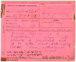二 阿片輸入ニ関スル件(1896/02/26);二-一 阿片輸入禁止期日問合ニ関シ安平和蘭領事ニ回答(1896/02/26);二-二 阿片輸入ニ関スル在打狗英領事ノ照会ニ対スル回答(1896/02/27);二-三 安平英領事及和蘭領事異議申立ニ関シ回答(1896/02/28);二-四 安平英領事及和蘭領事異議申立ノ件淡水支庁長ニ通知(1896/02/29);二-五 阿片輸入禁止猶予ノ義ニ付独逸領事ニ回答(1896/03/03);二-六 セールス号阿片陸揚許可(1896/03/16);二-七 阿片輸入禁止ノ件ニ付鳳山出張所ニ通達(1896/03/13);二-八 税関ニ積置ケル阿片引取方ノ件ニ関シ在京局長ニ回答(1896/03/15);二-九 フヲルモサ及セールス号輸入阿片買上願出ノ時許可差支ナキ旨在京局長通知(1896/03/26);二-一〇 フヲルモサ及セールス号阿片輸入特許(1896/03/27);二-一一 英船コンモウ号阿片輸入特許(1896/03/31);二-一二 現行条約施行ノ宣言ニ基キ阿片輸入顛末事務局ヘ報告(1896/03/12)