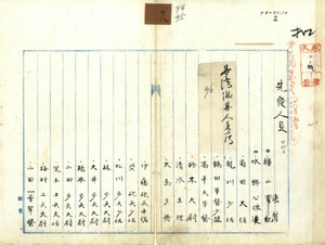 一八 台湾渡航人名簿、第一回明治二八年五月二四日 宇品発 樺山資紀・水野遵・角田秀松大佐・瀧川具和少佐・鶴田荒吉軍医少監・高平可輔大軍医・鈴木大尉・清水市太郎主理・大島久直少将・伊藤祐義砲兵中佐・柴五郎砲兵少佐・松川敏胤歩兵少佐・林歩兵大尉・大井菊太郎歩兵大尉・橋本勝太郎歩兵大尉・山田良円歩兵大尉・児玉徳太郎工兵大佐・梅村金十郎工兵大尉・山田秀治一等軍医・恩田重信一等薬剤官・平野不二彦工兵少佐・田中鎌助歩兵大尉・大久保利武・樺山資英・長田忠一・仁礼敬之・木下新三郎・千々岩英一・野村才二・平野勝・鮫島盛・大