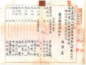 二九・三〇 日本語講習員ノ安原富次・小田深蔵ヘ、書記ノ木原豪・近藤久次郎・魚返煥平・梶山由郎ヘ、衛生員ノ富永久蔵ヘ、戸籍員ニ権藤震二・末岡武足ヘ、巡査心得ノ石川文次郎・藤村源太郎・石井熊太・橋本政次郎・今田始祐・服部亰蔵・松尾常造・山岡正・西川喜之助・山本米次・秋山善一・山口勇太郎・水上源吉・田内徳次・山川誥輔・荒沢光儀・根津恬如・浅井三平・神部隆之助・棚橋正憲・水野広太・林学進・徳弘慶太郎・小川仁・池上直熊・宮本直衛・[鵜殿長則・鵜殿長晴]・草野一二・山名時斉・中島喜一郎・井手源次郎・樋口重次郎・能勢浩(1896/03/26);二九・三〇-一 元公使館一等書記官杉村濬ト、日本語講習員ノ多羅尾光利・三屋大五郎・赤松三代吉・小林茂・大島丑三郎・増田龍作・林元三郎・美和元一・芝山豊平・須田裏・津田政二郎・中堂謙吉・加藤元右衛門・丸山徳蔵・藍原新二・滋野邦次郎・伊原太郎・中山重治・嶋村和四郎・井上武之輔・浅井政治郎・富岡鐐太郎・松本恒徳・高木平太郎・戸倉広雅・前田孟雄・新家鶴七郎・花田大六・宇津木五郎七・提貞廉・坂根十二郎・笠井源作・益田精二郎・富田仙太郎・渡辺高市・菅野赫次・相沢源大夫ヘ、日本語書記ノ須田小五郎ヘ、戸籍員ノ日野荘司・四(1896/04/07)