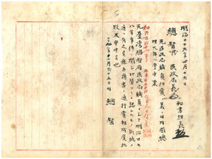 一 元民政局職員二十七八年事件ニ関スル行賞稟申(1896/02/25);一-一 千々岩英一・佐藤□太郎・樋口達次郎・村崎長旭・関常吉・沢口増蔵・鈴木計恵・名久井政樹・有馬秀雄・中神長久・安中忠恕・福田源蔵・市川重吉・桑島省三・橋本文次郎・彭城晋吉・南村周吉・阪元幸三・一柳文也・堀口貞利・森田信任・阪部竣・井上梯三・松田次左衛門・山内権五郎ノ御沙汰書請書ヲ賞勲局ヘ送付(1897/07/15)