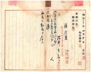 二九-一 桜井七郎民政局属ニ任シ七級俸総務部勤務(1897/04/10);二九-二 民政局総務部袋野環・佐藤銛四郎・前川見二・桜井又一郎職務勉励ニ付進級及任命(1897/04/12)