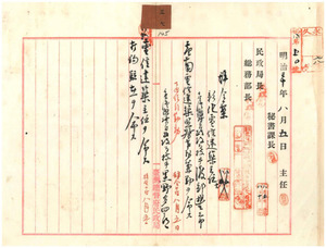 三七 民政局技手渡部豊三郎台南電信建築監督事務兼勤同黒野多四郎打狗電信建築主任ヲ命シ打狗駐在ヲ命ス