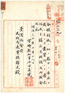 一一 三十年勅令十四号ニヨリ懲戒懲罰免除ニ付一年以上在職ノ巡査并該勅令公布後死亡シタル者ニ履歴書、戸籍調ヲ添付申出方宮崎県告示ニ付地方庁・各県知事・庁長ヘ移牒