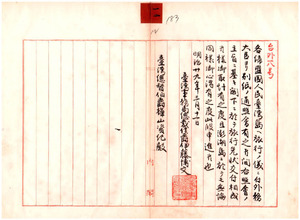 一二 外国人台湾内地旅行ニ関スル件(1896/03/11~1898/06/24);一二-一 外国人台湾内地旅行ニ関スル台湾事務局総裁伊藤博文ヨリ通牒(1896/03/27);一二-二 外国人ニ対スル台湾内地旅行券下附手続(1896/06/04);一二-三 外国人ニ対スル台湾内地旅行券下附手続手続英・独・蘭ノ各領事へ通知 (1896/06/05);一二-四 外国人ニ対スル台湾内地旅行券下附手続拓殖務大臣高島鞆之助ノ訓令ニ依リ報告(1896/06/09);一二-五 外国人ニ対スル台湾内地旅行券下附手続軍務局ヘ通牒(1896/06/15);一二-六 外国人ノ旅行シ得ベキ安全地域取調方台北県知事・新竹県知事・台中県知事・嘉義県知事・台南県知事・鳳山県知事・台東庁長・澎湖庁長・宜蘭庁長ヘ通達 (1898/04/15~1898/05/18)