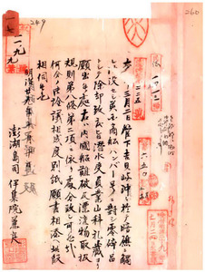 一七 澎湖島沖難破沈没船引揚ニ関スル件(1896/10/05~1898/12/02);一七-1 山科礼蔵零砕品除却願(1896/10/05);一七-2 山科礼蔵零沈没艦舩探険及引揚方ニ付願(1897/07/02);一七-3 山科礼蔵零許可(1897/07/21);一七-4 山科礼蔵零零砕品除却願ニ付澎湖庁ヘ回答(1897/10/07);一七-5 橋本清・有田喜一郎・岡田敬五郎沈没船引揚願 (1897/12/28);一七-6 橋本清・有田喜一郎・岡田敬五郎沈没船引揚願成儀澎湖庁ヘ通牒(1898/03/09);一七-7 以上ノ処分方行違ノ儀ニ付澎湖庁稟申(1898/06/01);17-8 山科礼蔵沈没船探険及引揚方許可取消ノ件(1898/06/20);一七-9 沈没船引揚処分ノ件(1898/10/12~1898/12/02)