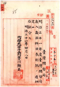 一二 三十一年度歳入出科目表内務大臣芳川顕正訓令及科目誤記発見ニ付内務次官松岡康毅ヘ照会ス