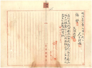 三七 郵便電信局通訳兼郵便電信書記代田敏夫及坂田弁次郎・小笹次郎ノ辞令郵送ノ際葫芦∪附近ニ於テ土賊ノ為掠奪セラレタル旨台中郵便電信局長曽祢吉弥ヨリ上申ニ付再渡ノ件