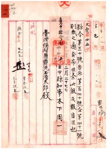 一二 三十一年台中県令及告示(県令第三十号書房義塾ニ関スル規定施行細則 告示第百四十号第二十一号租税検査印章紛失 同第百四十一号公学校教員免許状ノ件)