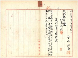 清國人上陸條例勵行并同勞働者取締規則發布ニ付廈門帝國領事ヘ通知及清國勞働者上陸拒絕ニ關シ英國公使抗議ニ依リ內務大臣ヘ稟議等ノ件