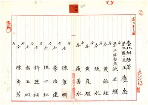 四四 土地調査事業ニ関シ王慶忠・沈王輝・黄維経・張水・黄崑輝・蘇善水・陳秉国・李法建・張士紅・許連福・高玉瑕・陳竒芳・鄭謙遜・周成輪ヘ賞詞