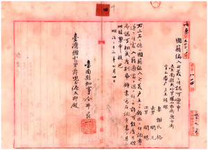 四 鳳山市街魚市街侯昭妻謝格・候開元・侯開賜国籍編入認可(1900/07/04~1900/10/03);四ノ一 盧徳祥及其家族ノ方省・徐玉貞・盧耀東・盧雲根・盧雲舫・陳蔭・盧紅棗・盧耀西入籍許可(1900/10/12)
