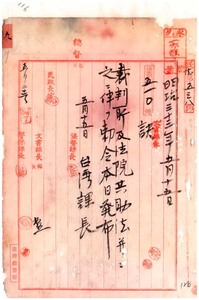 裁判所及法院共助法並ニ之ニ伴フ敕令發布ノ件(訓令第一七九號)、〔裁判所及法院共助法並ニ之ニ伴フ敕令發布通知〕、〔明治三十三年敕令第一七四號ヲ以テ本島內地間囚人及ヒ刑事被告人押送ハ基隆ヨリ直ニ長崎ニ送致スルノ訓令第一七九號ノ件〕、〔右ノ件ニ付台灣總督兒玉源太郎宛內務大臣西鄉從道訓令〕、〔共助法至急發布願內務次官松平正直宛民政長官後藤新平電請〕