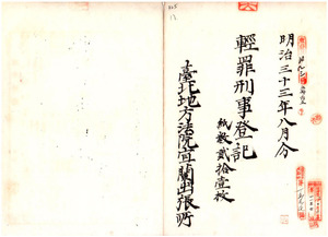 明治三十三年八月分輕罪刑事登記(台北地方法院、同院宜蘭出張所)