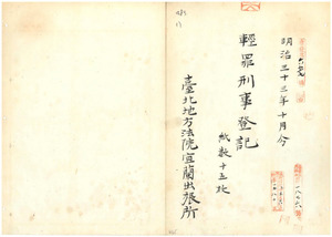 明治三十三年十月分輕罪刑事登記(台北地方法院宜蘭出張所、台中地方法院)