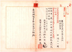 二二 台北地方法院宜蘭出張所検察局詰雇中間小二郎法院通訳ニ任シ台北地方法院検察局通訳兼台北地方法院検察局通訳ニ任命