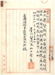 臺北醫院處務規程、分室規程、看護婦規程及施療規程〔並ニ記錄規程、非常救護規程、掃除規程、圖書取扱規程、職員勤務心得、守衛小使服務心得、當直心得、患者并入院患者訪問者心得及ビ書類樣式〕認可