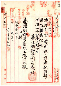 台北縣縣令第九號台灣下水規則〔及ヒ台灣家屋建築規則ヲ台北城外南方市區計畫地域ニ〕施行