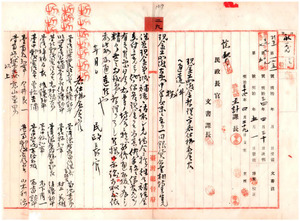 二九 現金前渡金整理方各仕払命令官民政長官後藤新平・臨時台湾土地調査局長後藤新平 ・台北郵便電信局長志村鐺太郎・樟脳局長後藤新平・台中郵便電信局長曽弥吉弥・ 台南県知事今井良一・台南監獄長高山幸男・通信課長事務官菊池末太郎・台北県知 事村上義雄・鉄道部長後藤新平・台中県知事木下周一・台中医院事務取扱富士田豁 平・台南郵便電信局長山本利渉ヘ通達