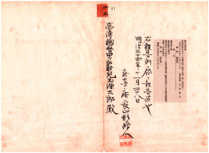 二五 台南庁令第三号 本年庁令第二号中改正(1901/11/28);台南庁令第四号 夜間爆竹ヲ放ツコトヲ禁ス(1901/12/14);台南庁訓令第一号 台南庁在職兵籍者取扱手続(1901/12/19);台南庁告示第一号 銃猟免状遺失ノ件 日付エラー台南庁告示第二号 猟銃所有許可証並ニ銃猟免状遺失ノ件(1901/11/29);台南庁告示第三号 蔡振聲・郭清香・董名・黄瑞山・蔡糞・陳閙詳・黄朝旺阿片烟 膏請売業等阿片烟吸食所営業禁止ノ件(1901/11/29);台南庁告示第四号 地租官租徴収事務開始(1901/12/07);台南庁告示第五号 台南庁管内大目降里・善化里西堡・外新豊里・楠梓仙溪西里収 入印紙売捌所ノ件(1901/12/15);台南庁告示第六号 台湾度量衡器販売特許者張師選・幡田義之助・小松繁吉・呉飄香ノ件(1901/12/18);台南庁告示第七号 盧文徳阿片煙膏取次人死亡ニ付銭祝生ヲ新規指定 (1901/12/20);台南庁告示第八号 銃砲所有特許証遺失ノ件(1901/12/20);台南庁告諭第一号 度量衡条制定ニ関スル件(1901/12/18)