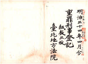 明治三十四年四月分重罪刑事登記(台北地方法院新竹出張所)