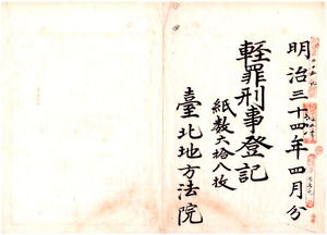 明治三十四年四月分輕罪刑事登記(台北地方法院新竹出張所)