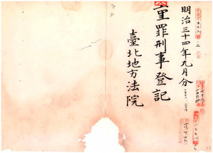 三 明治三四年九月分 重罪刑事登記台北地方法院宜蘭出張所 二枚