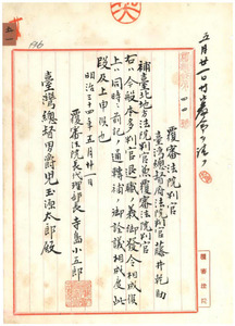 五一 台湾総督府台南地方法院判官法院判官本多潤老齢精神衰弱ノ為職ニ堪ヘサルモノト 認メ総督ヨリ諮問ニ付覆審法院判官総会ノ答申ヲ経テ昇給及退職ヲ命シ、及覆審法 院判官法院判官藤井乾助ヲ台北地方法院判官兼覆審法院判官ニ補ス