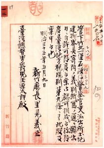 一二 新竹庁周春伝及ヒ姜振乾他五三五名[未記載]ヨリ石硬仔警察官吏派出所用土地建物器具寄付ノ件