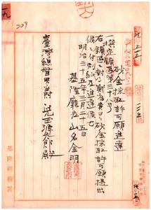 一九 基隆庁石碇堡八堵庄ノ内鉱第三五七号鄭為貴ヘ砂金採取願許可