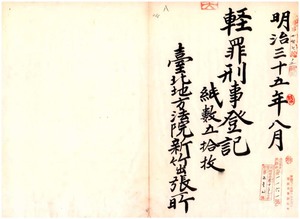 明治三十五年八月分輕罪刑事登記(台北地方法院新竹出張所)