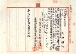 氏原靜修總督府法院通譯ニ任シ臺中地方法院檢察局通譯兼臺中地方法院通譯ニ補ス