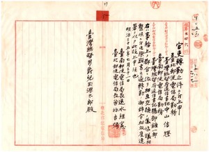 八 台北郵便電信局勤務総督府通信書記中山信輝ニ台南郵便電信局勤務ヲ命シ、台南郵便電信局勤務総督府通信書記勝部鐘一郎ニ台北郵便電信局勤務ヲ命ス