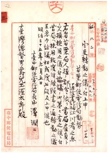 一三 苗栗郵便電信局勤務総督府通信書記補江川彦之丞ニ台中郵便電信局勤務ヲ命ス