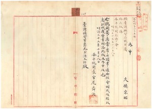 三六 元農商務属久徳宗昭ヲ総督府税関属ニ任シ安平税関勤務ヲ命ス