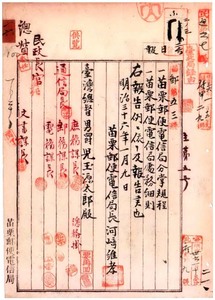 一六 苗栗郵便電信局長河崎維孝ヨリ報告アリタル同局分掌規程及ヒ同局処務細則ノ件