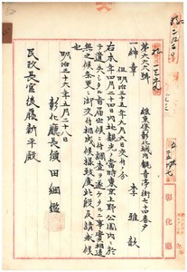 四 彰化庁管下線東堡彰化城内観音亭街李雅■(音+欠)紳章遺失ニ付キ再下付ヘ繋ルノ件