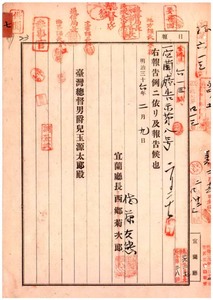 七 第八号 宜蘭庁頭圍堡下リョ庄荘月中・員山堡深溝庄黄林氏阿墊・頭圍堡港澳庄土名好逍遙張阿全・民壮圍堡公館庄林渓水ニ船鑑札流失ニ付キ該鑑札ヲ無効トス