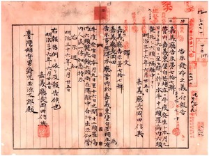 嘉義廳告示第七十七號嘉義東堡管下ニ於テ牛疫發生ニ付キ牛羊屬ノ出入及ヒ病毒傳播ノ虞アル物品ノ運搬停止ノ件
