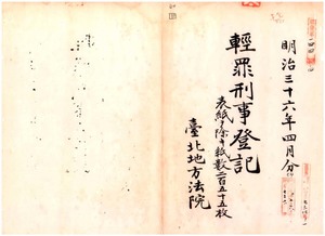 明治三十六年四月輕罪刑事登記、表紙ヲ除キ紙數二百五十五枚、台北地方法院