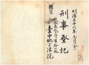 明治三十六年九月輕罪刑事登記、紙數表紙ヲ除キ百拾四枚、台中地方法院