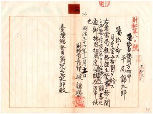 平尾錦太郎關稅ニ關スル事務ヲ囑託セラレ民政部財務局勤務ヲ命セラル