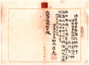 三四 第五回内国勧業博覧会出品ニ関スル事務嘱託吉倉清次郎ヲ御用済ニ付キ嘱託ヲ解キ、通訳事務嘱託博覧会事務嘱託荻野玄八ハ大阪内国博覧会出張先ニ於テ虚偽ノ陳述ヲナシ別ニ金銭ヲ得ント計リタル廉アリタルニ依リ懲戒処分トシテ嘱託ヲ解ク
