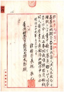 一六 高等土地調査委員洪文光死亡ノ為メ補欠トシテ台中庁下ノ蔡蓮航ニ高等土地調査委員ヲ命ス