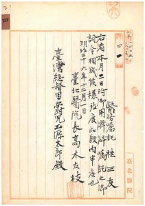 四 台北医院医務嘱託桂三友ヲ御用済ニ付キ解嘱シ事務格別勉励ニ付キ賞与ス
