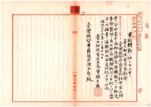 二七 台北郵便電信局勤務総督府通信書記記本寅之助ニ台中郵便電信局勤務ヲ命ス