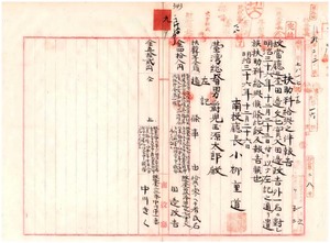 九 故南投庁巡査田辺文七ノ父田辺政吉及ヒ故巡査中川平一ノ妻中川きくニ対シ遺族扶助料給与ニ付キ南投庁長小柳重道報告ノ件