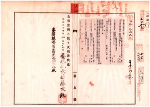 九一 第九一号 台北庁大加蚋堡北門外后街ノ張蒋伝ノ人力車車体検査証・張柿ノニ付キ台北庁土地調査委員会ニ於テ査定ノ件