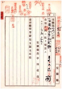 一二 第一二号 宜蘭庁管内頭囲堡港澳庄・梗枋庄・大渓庄・大里簡庄ニ牛疫流行ニ付キ牛羊属ノ出入及ヒ病毒伝播ノ虞アル物品ノ運搬ヲ禁止ス