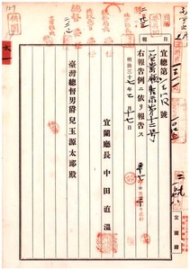 六一 第一二号 基隆庁・桃仔園庁両管内ニ豚虎列拉発生及ヒ桃仔園庁管内ニ牛疫発生ニ付キ両庁ヨリ通知ノ件
