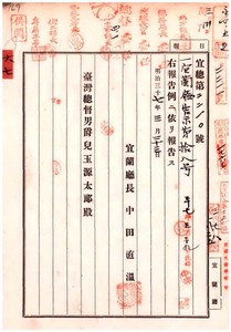 六七 第一八号 宜蘭庁本城堡宜蘭街相島善吉ハ猟銃免状ヲ、藍有渓・林承趙・簡慶凞・謝同海・陳友文・高老歪・黄樹ハ阿片煙膏購買吸食特許鑑札ヲ亡失ニ付キ該鑑札ヲ無効トス